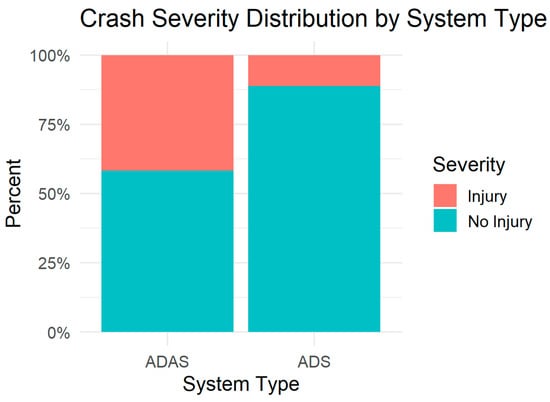 The introduction of vehicle automation has transformed road safety paradigms [9]. As the prevalence of Automated Driving Systems (ADS) and Advanced Driver Assistance Systems (ADAS-L2) increases, understanding the nature and outcomes of related crashes becomes critical [10,11]. An ADS refers to the hardware and software that collectively enable a vehicle to perform the entire dynamic driving task. Essentially, it is a system that can handle the complexities of driving without requiring constant human input, at least within its operational limits. ADAS at Level 2 (L2) is a set of technologies that provide both steering and acceleration or deceleration assistance to the driver. This means the vehicle can manage lane centering and maintain a safe following distance from other vehicles, but the driver must remain engaged and be ready to take over control at any time [12].