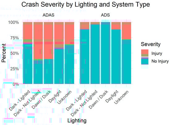 Figure 2 illustrates the interaction between lighting conditions and system type on crash severity. For ADAS-L2 crashes, injury outcomes increase notably under poor lighting, particularly in dark environments. This suggests that reduced visibility places greater demands on the human driver, thereby increasing injury risk when the driver must rapidly re-engage from partial automation. For ADS crashes, injury rates remain relatively low across lighting conditions. However, a modest elevation appears in dark or transitional (dawn/dusk) settings, indicating that environmental visibility still poses challenges even for higher-level automation. These differences underscore that lighting conditions have a more pronounced influence on severity for ADAS-L2 crashes than for ADS crashes, highlighting the combined impact of visibility and system type on crash outcomes.