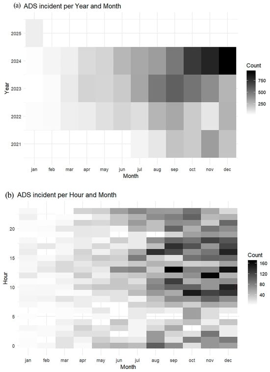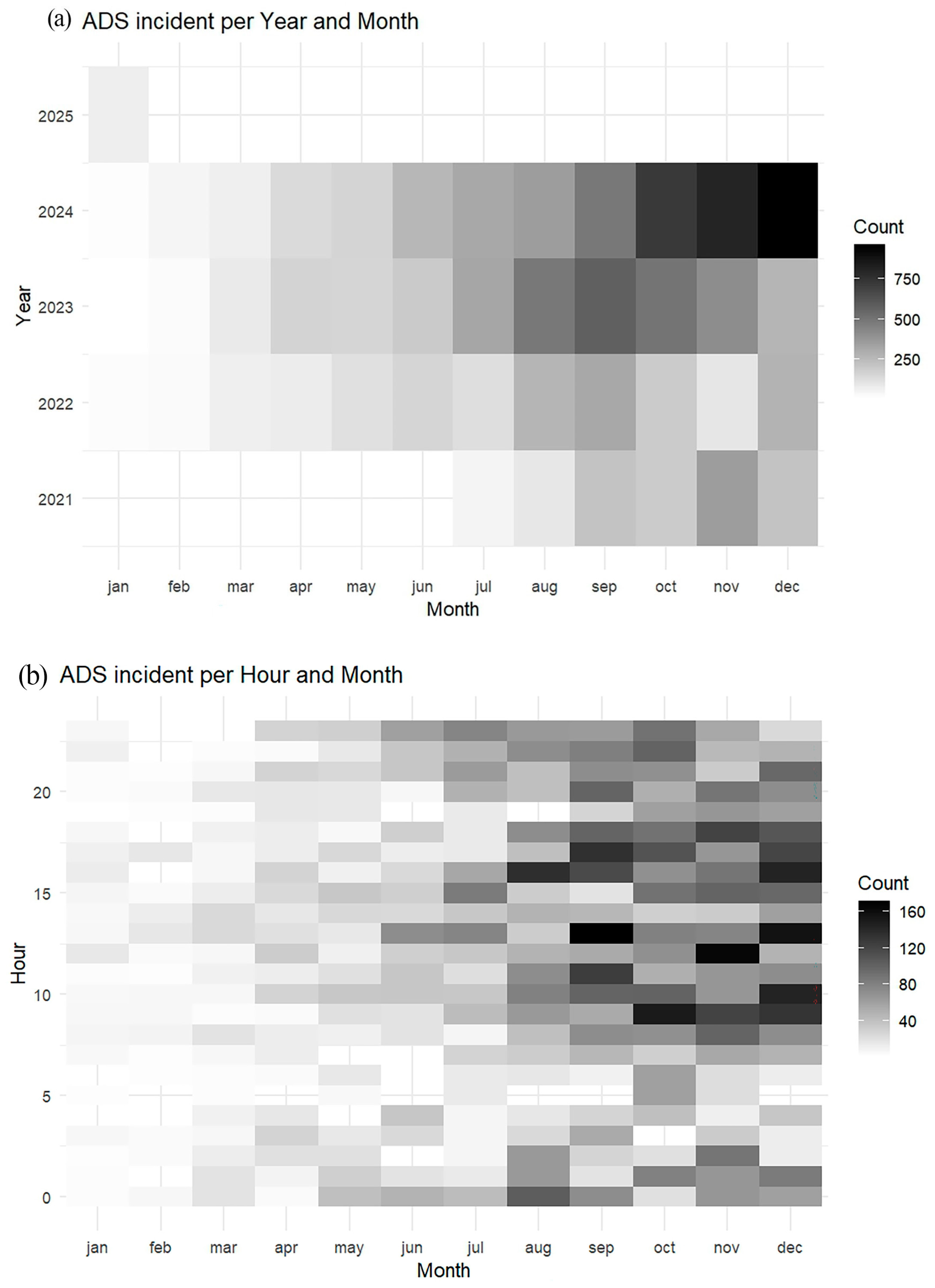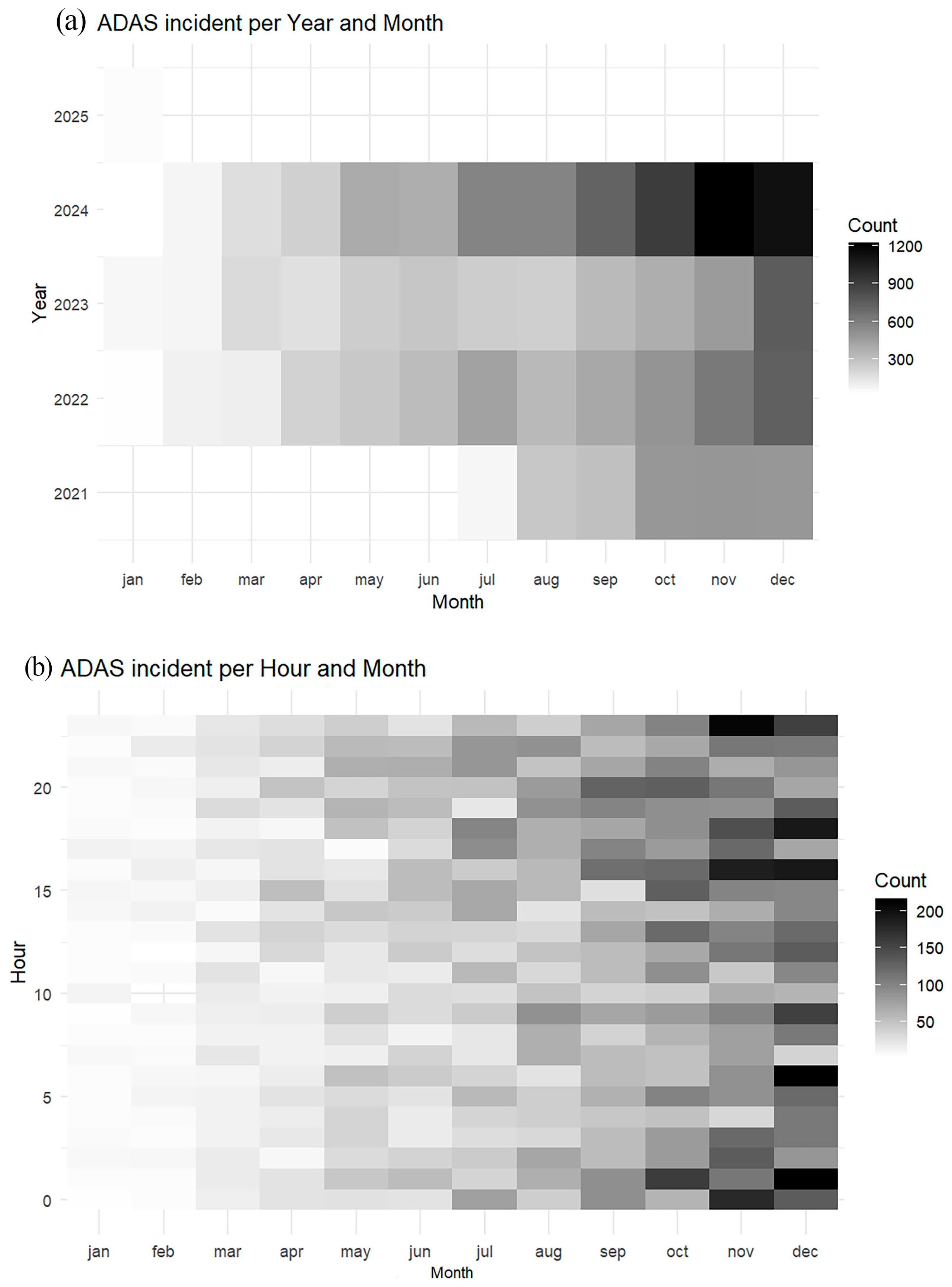 Figure 3a,b display temporal trends of ADAS-L2 crashes. Figure 3a illustrates a steady increase in incidents from 2021 to 2024, with a notable concentration in the last quarter of 2024, particularly in November and December. Figure 3b shows that most crashes occur during the late morning to early afternoon hours, particularly between 10:00 am and 2:00 pm, with the highest frequencies observed from October to December. This pattern may reflect increased roadway activity or environmental conditions affecting ADAS-L2 performance during those times.