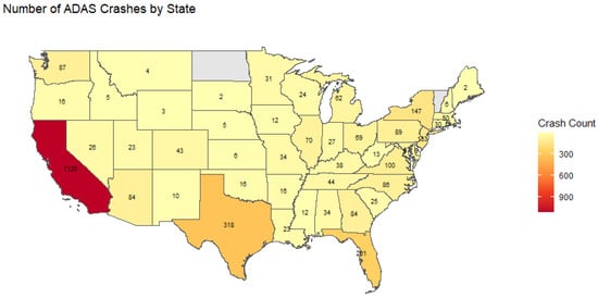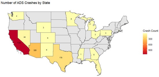 Figure 5 shows crashes involving ADS technologies. A notable pattern emerges, with a significant concentration of crashes in California (1125 crashes), followed by Arizona (328) and Texas (178). The dominance of California is expected, given the high density of ADS testing and deployment by companies like Waymo, Cruise, and Zoox in the region. Many states appear in gray or lighter shades, indicating limited or no recorded ADS crashes, reflecting the fact that ADS testing is concentrated in a small number of states.