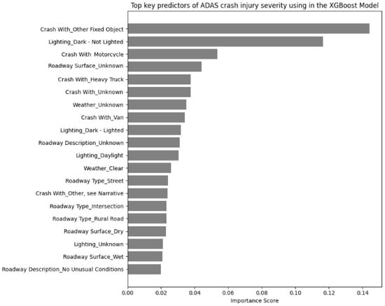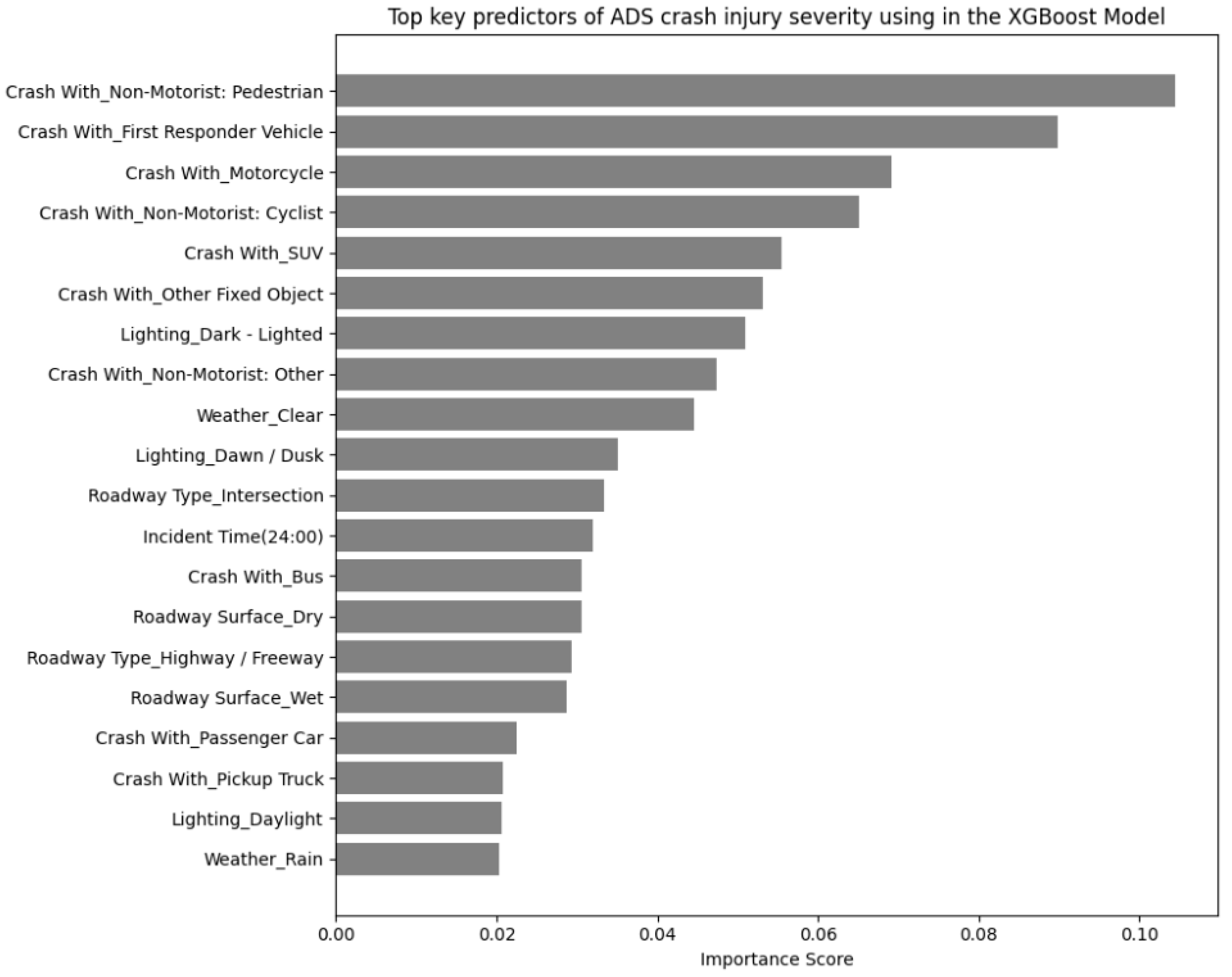 The predictors included in the study represent all crash-related variables that were consistently reported in the NHTSA Standing General Order dataset and that have established relevance in the transportation safety literature. These variables, such as lighting conditions, roadway type, weather, and crash partner type, are among the few reliably available inputs across ADS and ADAS-L2 crash reports. XGBoost evaluates all predictors simultaneously and assigns importance scores based on their contribution to improving model performance. Therefore, the predictors highlighted in the study are those that the XGBoost model identified as the most influential in distinguishing between injury and non-injury outcomes. Their inclusion reflects both their theoretical significance in crash-severity research and their empirical importance within the available dataset.
