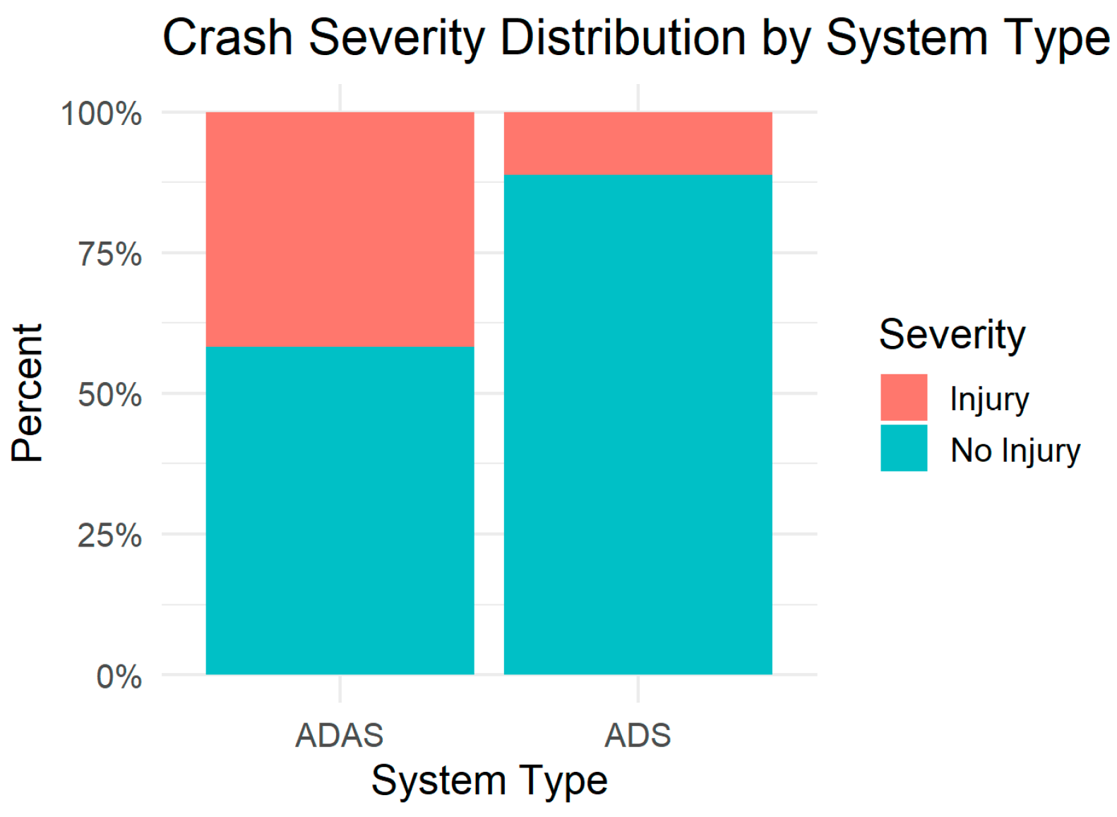 Figure 1 compares the injury distribution between ADAS-L2 and ADS crashes. A clear difference emerges: ADAS-L2 crashes have a substantially higher proportion of injury outcomes compared to ADS crashes. This pattern aligns with the operational differences between the two systems. ADAS-L2 crashes still rely heavily on human supervision, which may lead to delayed reaction times or incomplete hazard detection, especially in unexpected scenarios. In contrast, ADS crashes, which largely occur during controlled testing, show a much lower injury rate, suggesting that ADS vehicles may be involved in collisions in less hazardous contexts or at lower speeds. This comparison highlights system type as an important factor influencing crash severity.