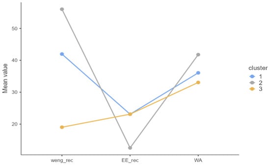 Plot of means across clusters. [Note: Cluster labels should be added directly to the figure: Cluster 1 = Disillusioned; Cluster 2 = Motivated & Healthy; Cluster 3 = Motivated & Stressed].