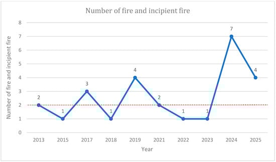 During this period, events occurring between 2013 and 2025 were reviewed, recording a total of 26 events, including 14 fires and 12 fire incidents (see Table 1).