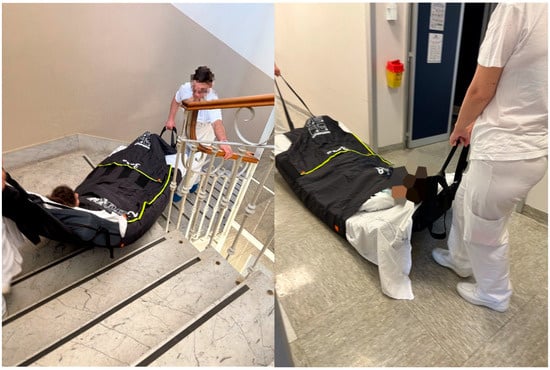 In this simulation, patient preparation and transport were carried out by two operators. It was observed that while two operators could perform the patient transfer from the bed, to exit the room they both needed to position themselves at the head of the bed, lifting the mattress as much as possible to reduce friction, until the sheet was correctly aligned with the evacuation route. Depending on the patient’s body structure and staff characteristics, assistance from a third operator—positioned at the head—may be required.
