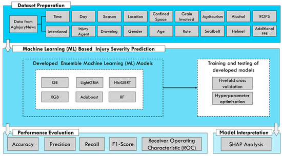 - Mermer, O.; Zhang, E.; Demir, I. Integrated Explainable Ensemble Machine Learning Prediction of Injury Severity in Agricultural Accidents. medRxiv 2025. [Google Scholar] [CrossRef]