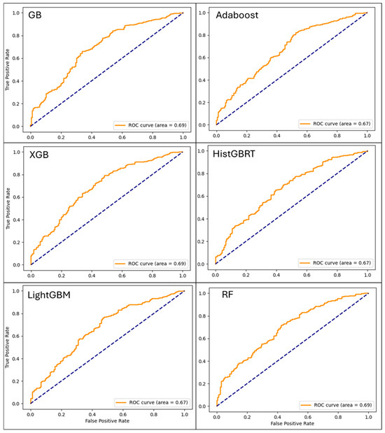 The ROC curves, displayed in Figure 3, visually confirm the models’ strong performance and ability to discriminate between classes. The curves for GB, XGB, RF, and AdaBoost are positioned favorably in the upper-left quadrant of the plot, indicating high discriminative ability between the fatal and non-fatal classes. The AUC values for these models were all approximately 0.69, a strong result that is significantly better than a random guess (AUC = 0.5). While LightGBM and HistGBRT showed slightly lower AUC scores (0.67), their performance remained strong. The overall proximity of the curves highlights that all tested models effectively utilized the dataset’s features to differentiate between severity classes, with only marginal differences in their predictive capacity, making them all viable options for this type of prediction task.