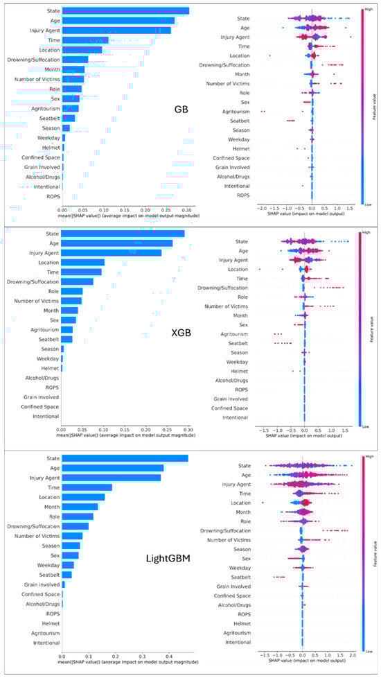 Global SHAP analysis for GB, XGB, and LightGBM models. Left Panel (Feature Importance): Features are ranked by importance; longer bars indicate a feature has a stronger overall influence on the model’s prediction. Right Panel (Summary Plot): Each dot represents a single incident. The dot’s position on the x-axis shows whether the feature pushes the prediction toward ‘Fatal’ (positive side) or ‘Non-Fatal’ (negative side). The color indicates the actual value of the feature (Red = High value, Blue = Low value).