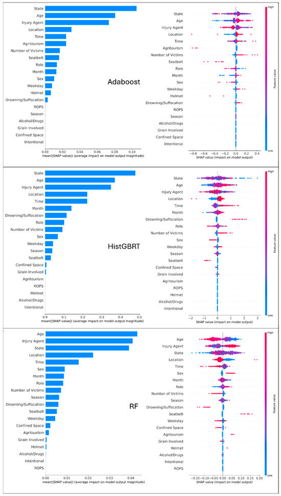 Global SHAP analysis for Adaboost, HistGBRT, and RF models. Left Panel (Feature Importance): Features are ranked by importance; longer bars indicate a feature has a stronger overall influence on the model’s prediction. Right Panel (Summary Plot): Each dot represents a single incident. The dot’s position on the x-axis shows whether the feature pushes the prediction toward ‘Fatal’ (positive side) or ‘Non-Fatal’ (negative side). The color indicates the actual value of the feature (Red = High value, Blue = Low value).