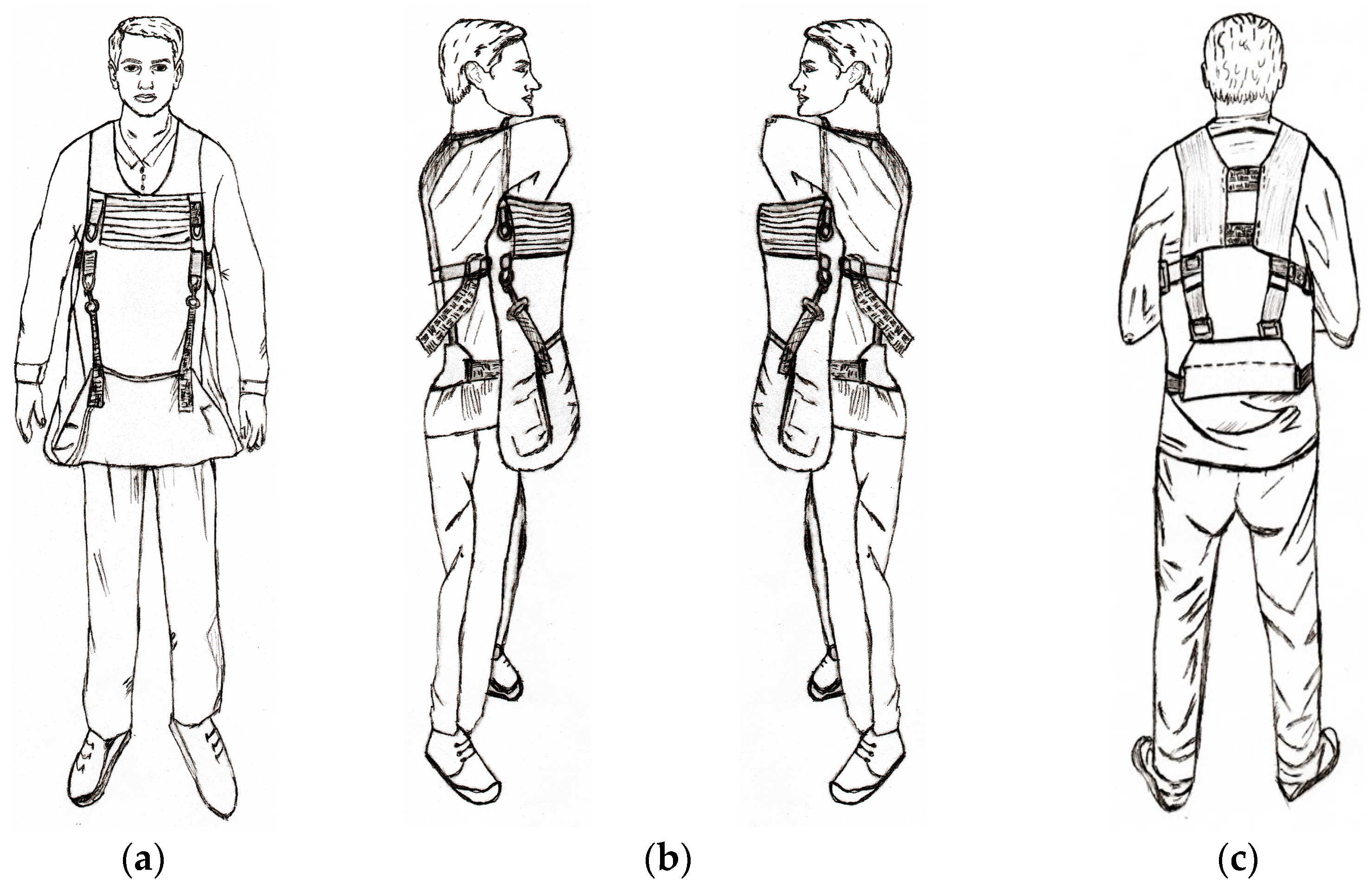 Figure 1). It is made of durable materials and features a system of adjustable vertical and horizontal straps that distribute the load evenly across the shoulders, back, and waist, thereby reducing lumbar pressure and fatigue during extended work periods.