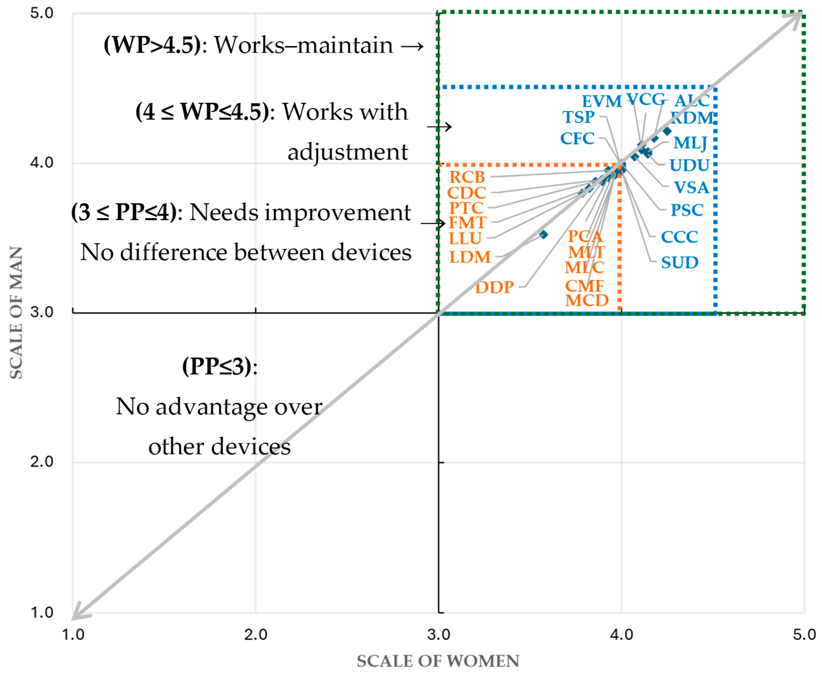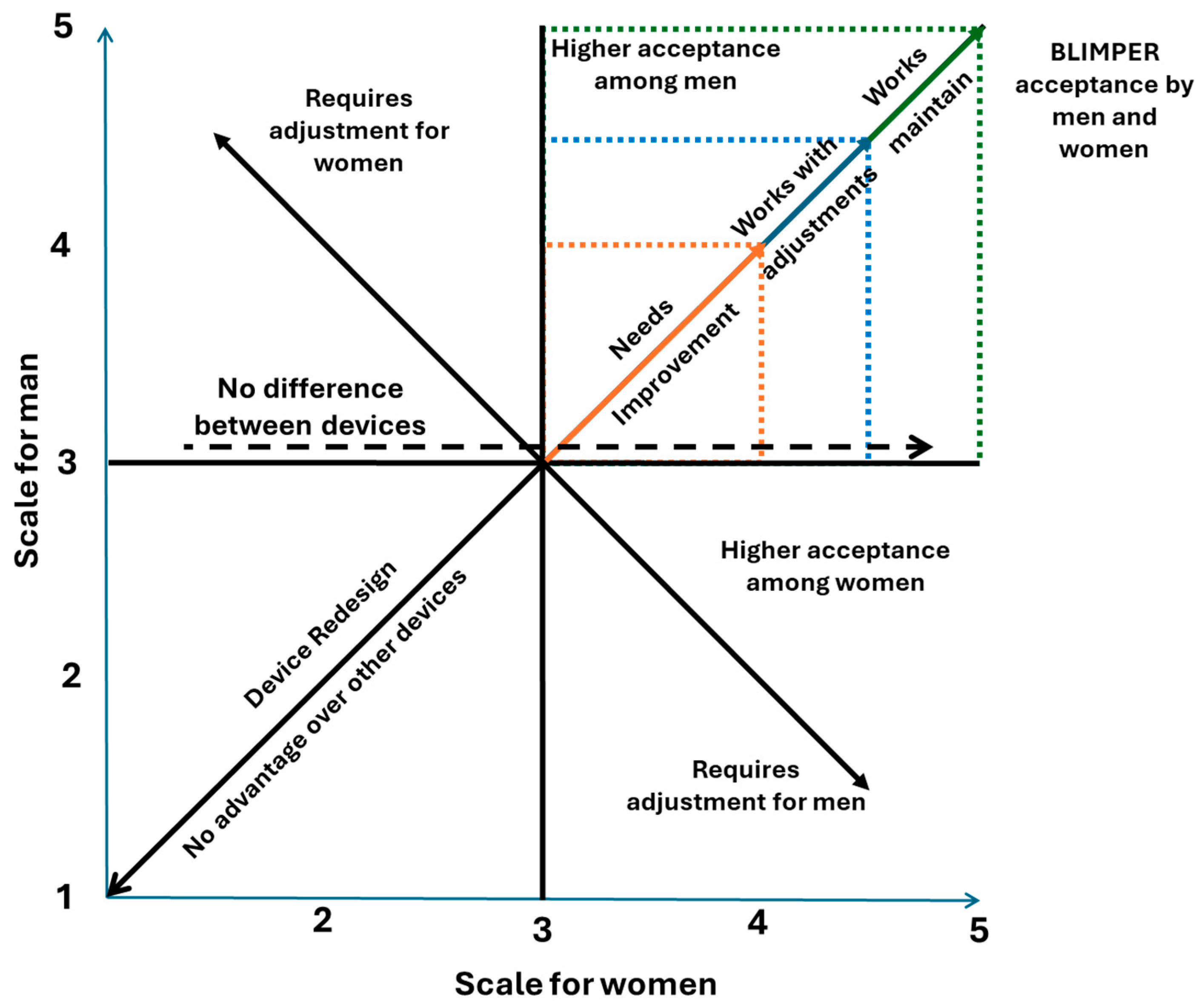 The results indicate that half of the evaluated variables (12 out of 24) are positioned in the “works with adjustments” quadrant, suggesting that both women and men perceive the BLIMPER harvesting tool as acceptable and functional, though still requiring design refinements (
