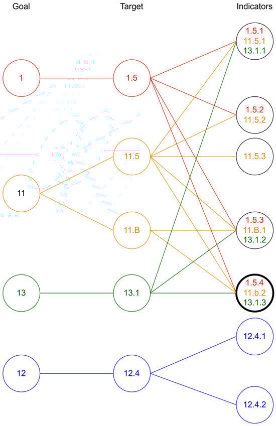 Indicators 1.5.4, 11.B.2, and 13.1.3 unequivocally define the need for local governments to adopt risk reduction plans. These indicators, together with those in target 12.4, imply the need for risk reduction plans that explicitly consider the TDG. Figure 1 shows the overall structure, showing how individual SDGs move to specific targets and how the targets are linked to indicators, thus showing how the individual indicator is used in different contexts.