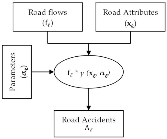 - Accident—happens at time (t) and at a point (w) of a road link ( w ∈ ) crossed by a flow of vehicles (fℓ) of different categories (light vehicles for transport of people, heavy vehicles for transport of goods, …);