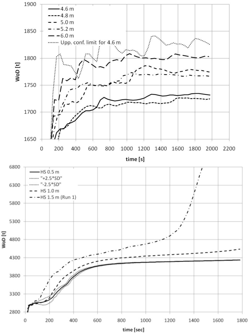 The final outcome of the WoD analysis was that the flooding process of the surviving cases could be characterised by a statistically unique (for any given damage) limiting mass of floodwater, independent of sea-state and time of exposure. It is important to note that the limiting amount of floodwater coincides with the quantity obtained for the highest sea-state at which no losses were observed—the lower boundary of the capsize band. Increasing the sea-state further does not have an impact on the limiting value but it simply increases the probability of exceeding it (i.e., the higher is the sea state the higher is the probability that the limit amount of floodwater will be exceeded and the ship will capsize). This probability is dependent on time of exposure—in the extreme case of infinite observation time, all realisations in sea-states higher than the lower capsize boundary would at some point experience floodwater accumulation in excess of the critical mass and face inevitable loss (this is well in-line with the unit-step representation of the capsize band).