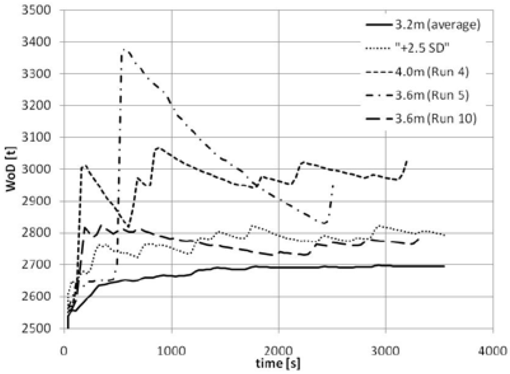 The above reasoning allowed formulating a procedure for analysing WoD (or floodwater accumulation in the general case) based on an averaged 95th percentile of floodwater mass (derived from numerical simulations) calculated within the cumulative time (i.e., measured at intervals equal to the wave period).