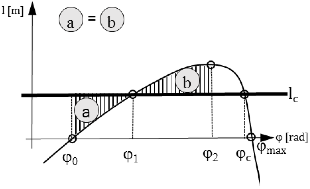The condition “a” = “b” indicates equilibrium condition in which work of the heeling moment is equal to the change of ship’s potential energy.
