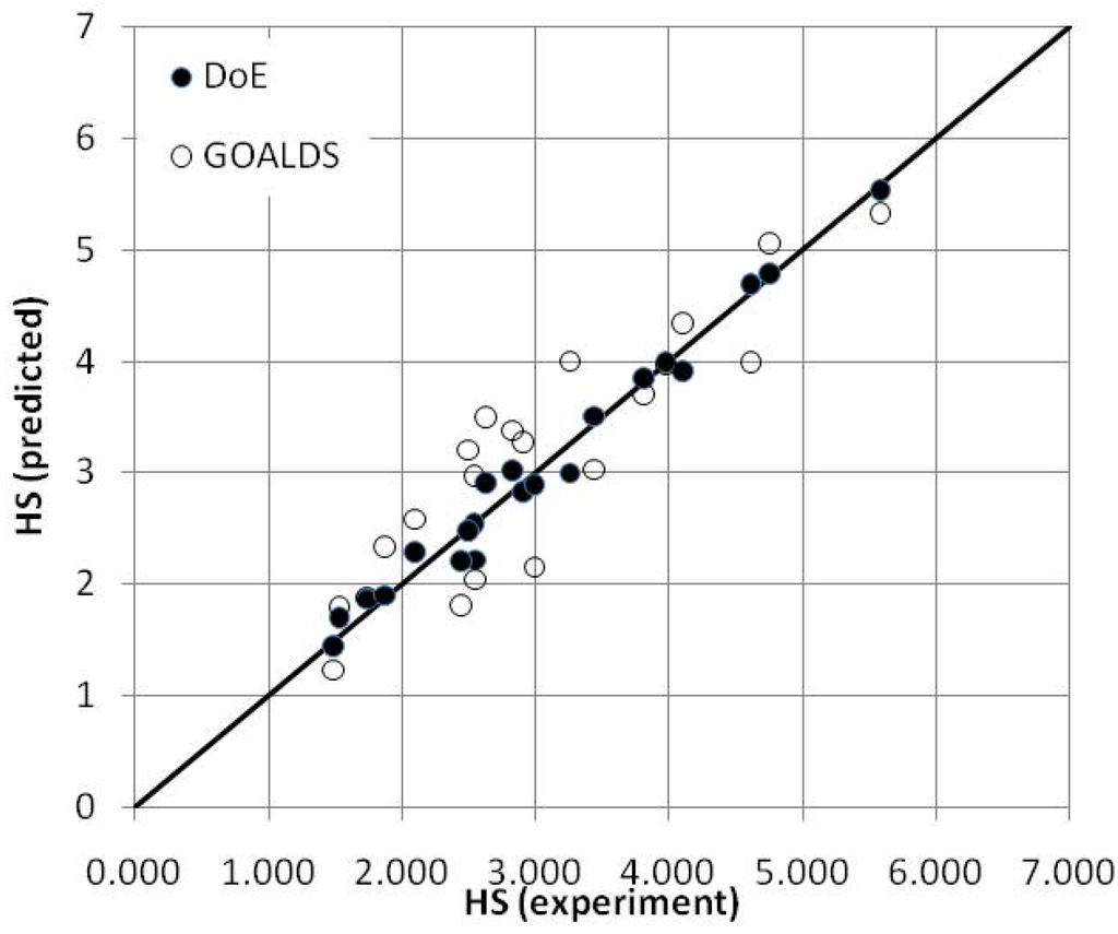 resulted in 0.99 correlation with the experimental data, which was considered a satisfactory test concerning completeness of the parameter set (the correlation coefficient calculated for the GOALDS prediction was about 0.90, see
