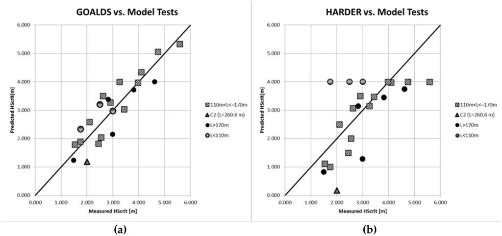 Figure 12 shows clearly, GOALDS formula accounts well for size of the ship with the prediction errors of similar magnitudes across all categories. On the other hand, the HARDER formula demonstrates significant variations in prediction errors depending on ship size. In case of GOALDS prediction, 100% of sample points fell within ±1.0 m from the measured