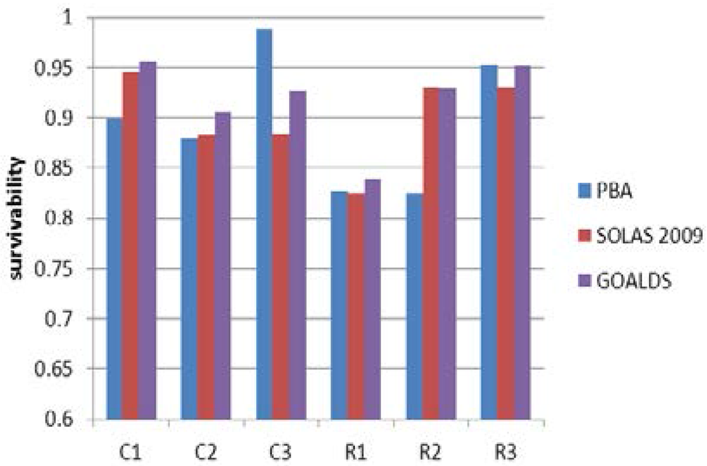 Figure 13, the discrepancies are general within a few percent, with the new s-factor giving generally higher (than SOLAS) values for all but the small RoPax (R2). The highest difference between current and new s-factors is shown in the case of the very large cruise vessel (C3) for which PBA predicts an average survivability of about 98%. It should be borne in mind, however, that in spite of the small discrepancies between SOLAS 2009 and GOALDS predictions, the results are not conclusive and should be approached with caution. Specifically, it has been demonstrated in the foregoing that the SOLAS s-factor exhibits much lower accuracy than its GOALDS counterpart, which as shown for the tested RoPax vessels resulted in 4.5 m confidence interval for