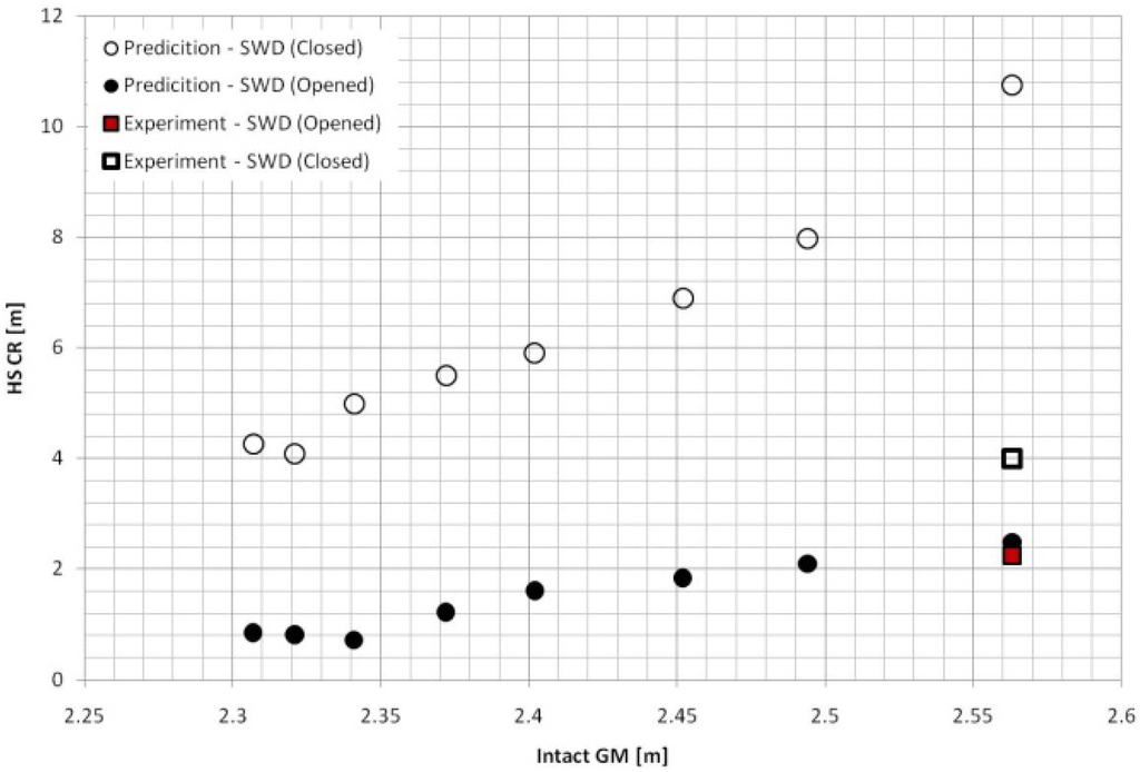 Finally, neither the SOLAS nor GOALDS formulation could be sufficiently verified against experimental data for cruise ship models. Due to the complexity of the physical model tests of survivability, the GOALDS data appropriate for comparison are very limited and consist of only two valid experimental points for C1. These points comprise two runs with semi-watertight doors open and closed performed in waves, starting from the damage equilibrium position. These are presented in the