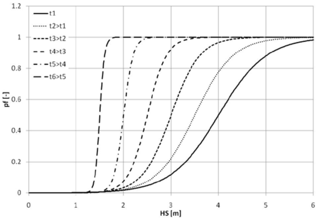 Assuming that the probability of survival, , can be approximated by a unit step function centered on the sea state the Hscrit constitutes the 50th percentile significant wave height the vessel subjected to particular damage scenario may survive for 30 min (this corresponds to the abscissa of the inflection point of the sigmoid obtained for t = 30 min and is in line with the previous research):