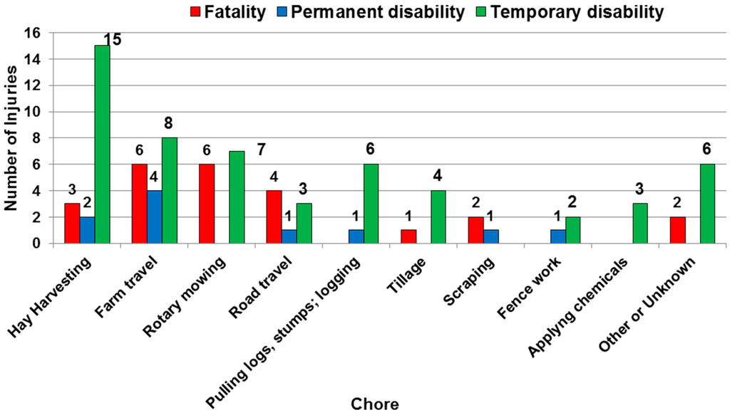 More specifically, we found the following percentages of types of chores with fatal overturn incidents (n = 24): farm travel (25.0%), rotary mowing (25.0%), road travel (16.7%), hay harvesting (12.5%), scraping (8.3%), and other or unknown (8.3%). The nonfatal injuries (n = 64) were separated into permanent and temporary disabilities, as shown in Figure 1. The association of permanent disabilities with tractor overturns (n = 10) were farm travel (40.0%), hay harvesting (20.0%), road travel (10.0%), pulling logs or stumps and logging (10.0%), scraping (10.0%), and fence work (10.0%); The association of temporary disabilities with tractor overturns (n = 54) were hay harvesting (28.8%), farm travel (14.8%), rotary mowing (13.0%), pulling logs or stumps and logging (11.1%), road travel (5.6%), applying chemicals (5.6%), fence work (3.7%), and other or unknown (11.1%).