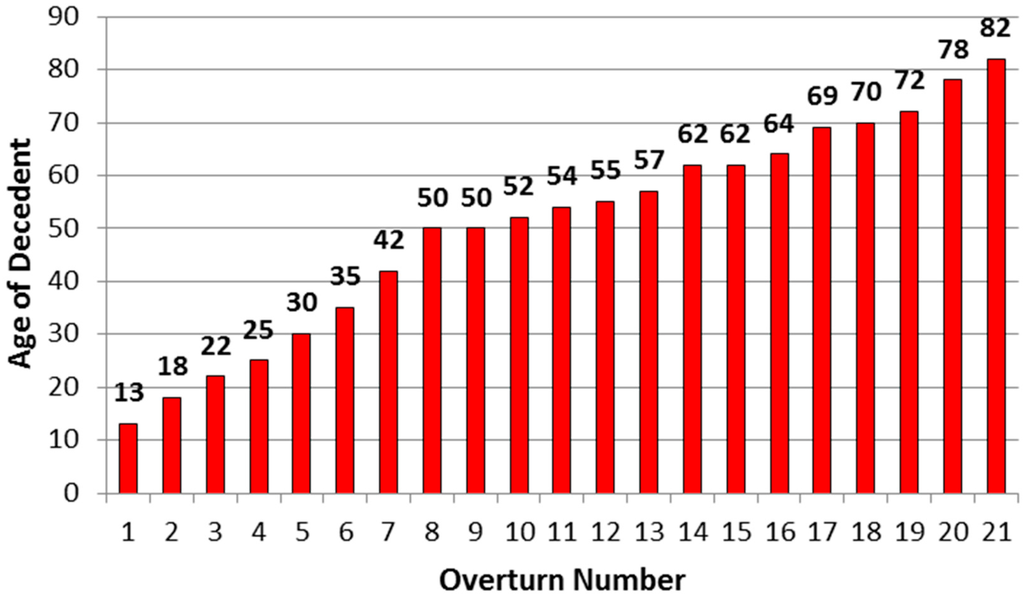 Descriptions of chores for 23 of the 24 fatal non-ROPS tractor overturns were distributed within the non-overlapping categories shown in Table 4. Of these 24 fatally injured operators, 11 received EMT, nine did not, and EMT was unknown for four individuals. Of the 24 operators, 14 died in ≤1 h. Of the five who were admitted to a hospital, one lived for 24 h (one day), one for 48 h (two days), two for 72 h (three days), and one for 336 h (14 days). Four operators, none of whom were admitted to a hospital, lived for an unknown period of time before their death. All 24 decedents were males. Twenty were family members (i.e., kin) of the survey respondents, and three were not. Family status was unknown for one individual. Operator age at the time of death was known for 21 individuals and distributed as shown in Figure 2.