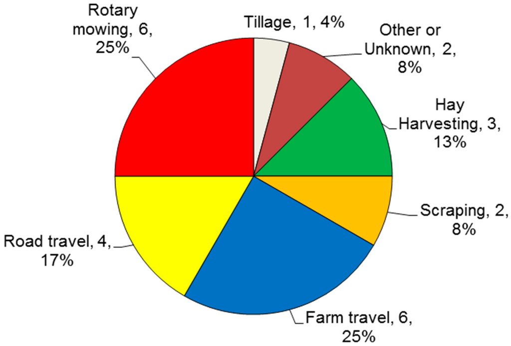 Lehtola et al. conducted another analysis of 136 tractor-related fatalities in Iowa for the years 1988–1992 based on newspaper reports [20]. Of 77 overturn-related deaths in the cohort, 44 (59%) occurred in a field or farmyard, and 28 (37%) occurred on public roads in which no other vehicle was involved. Overturns in the field included carrying loads high with a loader (large round bales or soil), spraying weeds along fence lines, driving along a dead furrow, hay harvesting, and mowing of untilled ground and terraces. In this study, 41% of deaths regarding tractor overturns occurred on roadways, many when mowing ditches, while the remaining chores involved carrying loads high with a loader, spraying weeds along fence rows, herding cattle, driving along the edge of a dead-furrow, performing haying operations, or mowing untilled ground and terraces.
