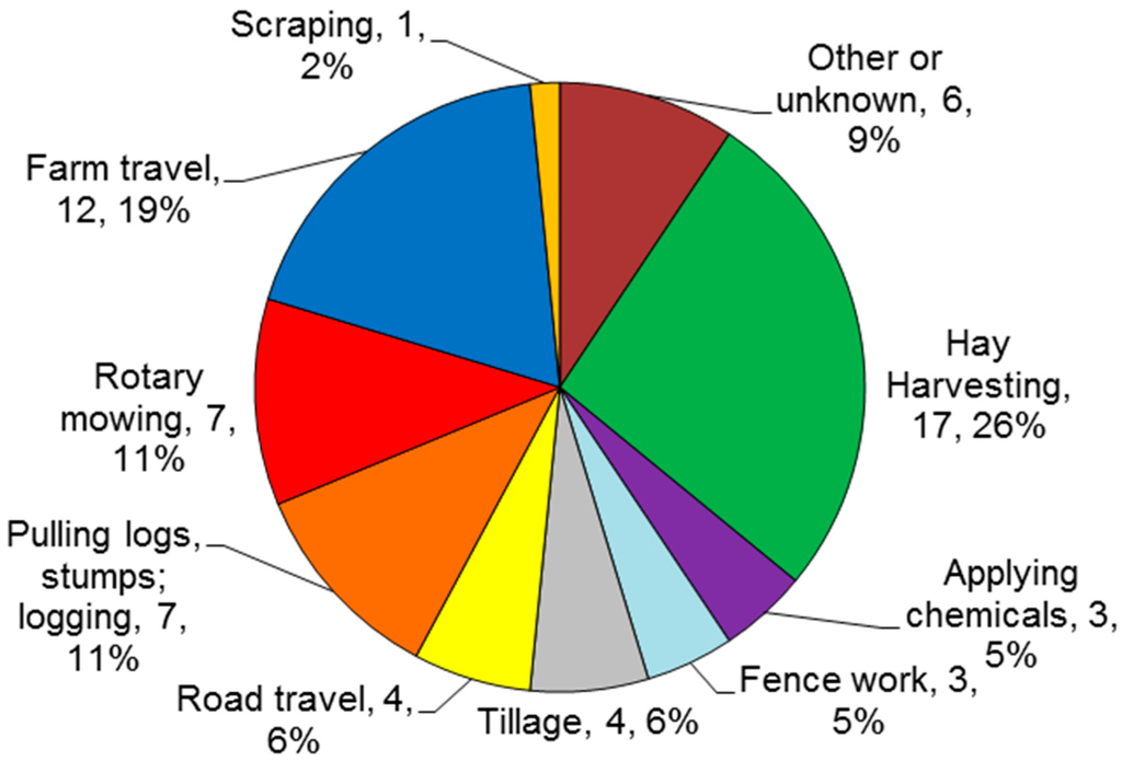 In 1966, Knapp warned that implements added to the tractor can “radically” change its stability in different and unexpected ways [1]. Unstable conditions may lead to tractor overturns that are responsible for thousands of deaths and serious injuries [2]. While studies have addressed the overturn hazard related to tractor design, training, environmental conditions, including slope and terrain, and public policies, scant attention has been given to tractor use at the time of an overturn incident with one exception, roadway travel [3,4,5,6]. To this day, tractor overturns remain the leading cause of death on farms in the United States and continue to merit attention regarding the dimensions of the hazard, including chores associated with the overturns [7]. The history of success of rollover protective structures (ROPS) for reducing overturn-related deaths and serious injuries is well-documented [8]. ROPS are known to reduce overturn-related fatalities by up to 98% [9].