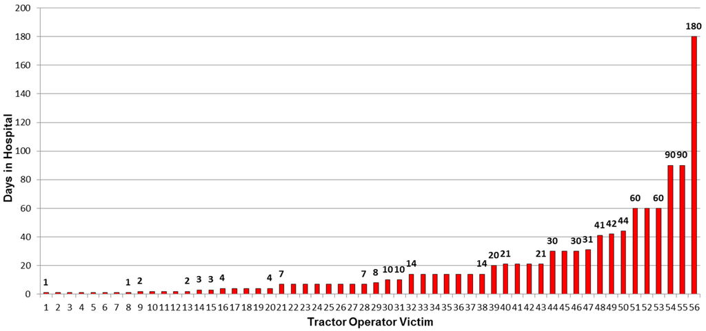 It is worth noting that hospital stays regarding serious injuries associated with ROPS-equipped tractor overturns ranged from one to six days with a mean of 3.5 days, which is in sharp contrast with non-ROPS tractor overturn-related injuries that are strongly skewed toward much longer hospital stays as shown in Figure 5 with a mean of 20 days. Indeed, the length of hospital stays regarding ROPS-equipped tractor overturn injuries would reside at the low end of the non-ROPS tractor scale for hospital stays, rising up across two-thirds of the scale beyond six days to 180 days for a hospital stay, showing improved safety provided by ROPS. Improved safety of ROPS-equipped tractors was also shown by no permanent injury and many fewer days lost from work.