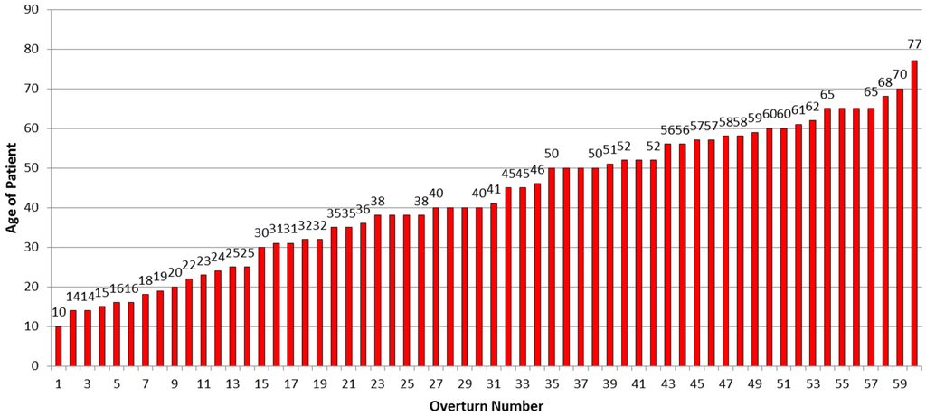 Operator age at the time of nonfatal, non-ROPS tractor overturns was known for 60 farmers as shown in Figure 6.