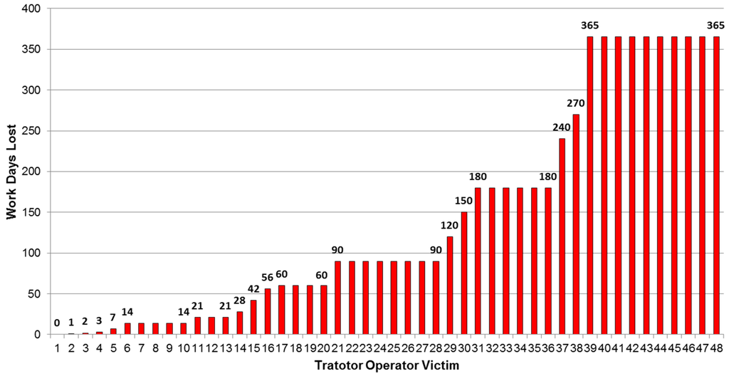 Excluding eight farmers whose permanent disabilities prevented them from performing farm work or other work, the days of farm work lost were known for 48 farmers. These 48 farmers lost a total of at least 6742 farm work days with a mean of at least 140.46 days each (SD = 133.24) with a median of 90 days. Days of farm work lost are strongly skewed to the right, which suggests that non-ROPS tractor overturns result in high injury severity rates as shown in Figure 7.
