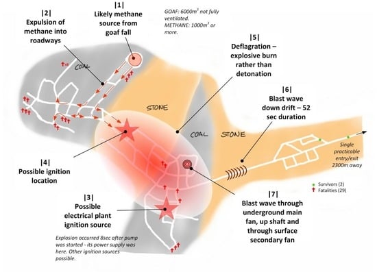 - Davis, S.G.; Engel, D.; van Wingerden, K. Complex explosion development in mines: Case study—2010 Upper Big Branch mine explosion. Process Safety Progress 2015, 34, 286–303. [Google Scholar] [CrossRef]