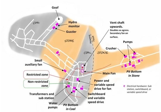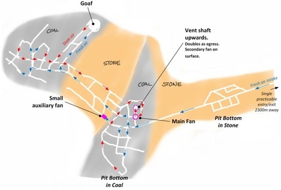 Important parts of the ventilation system are the fan, the routing of air through the mine, and the ingress of fresh air. The fan needs to have sufficient capacity to get the airflow to all parts of the mine. Localised pockets of high-concentration methane may form around mining machines, and require ventilation to dilute the methane to safe concentrations []. Sometimes small auxiliary fans are used to blow air into dead-ends and other areas of low-flow. These were used at Pike. Figure 3 shows the air flow through the mine. Note the location of the main fan and the ventilation shaft in the coal, and how deep they are into the mine. Also note the electrical plant which was necessary to power the fans.