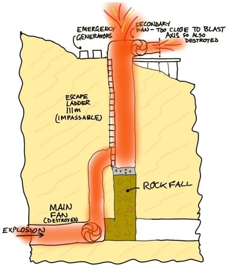Miners may be injured or unconscious, and may need external assistance to escape, hence a rescue has to be considered. This is only safe if methane levels are below the flammable range [,]. In turn this requires a working ventilation system, or the means to immediately re-establish ventilation. This did not occur, due to the poor design and the difficulty of repair.