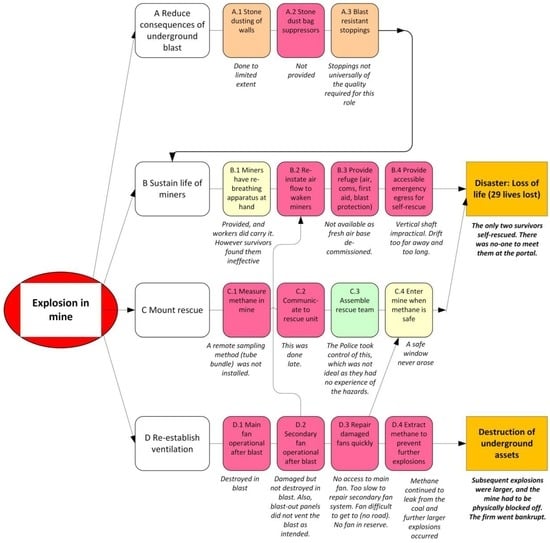 The dominant methodology for hazard reduction is risk management, e.g., ISO 31000 [], with its emphasis on prevention of risk by treatments applied before the risk eventuates. Although the risk management method does not preclude the provision of post-accident recovery mechanisms, these are often de-emphasised in practice. In the case of the Pike River disaster, the organisation was attempting to apply preventative risk management, though the execution was poor and undoubtedly contributed to the disaster occurring. However, as will be shown, the recovery perspective was practically non-existent. From the recovery perspective an accident unfolds over time, and there are opportunities to reduce its extent, providing that mechanisms have previously been put in place to do so. An accident does not immediately progress from initiation of the hazard to a full disaster: deliberate actions of intervention are generally possible. These recovery mechanisms will not necessarily prevent the hazard arising, but they can change the locus of the accident propagation sequence so that only a few deaths occur rather than many (disaster).