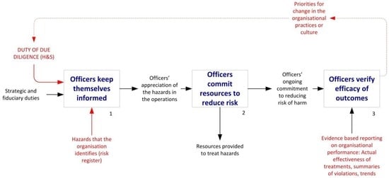 However a major change occurred in the additional work stream required of all directors and executives (‘officers’). The Duty of Due Diligence requires officers to make themselves informed of hazards and ensure that the organisation is dealing with them effectively, see Figure 10. Ignorance of the hazards faced by workers is no longer a defence, but is instead an offense in its own right. Nor can officers delegate the duty. Even though they can task others in the organisation to implement the health and safety treatments, the officers still retain responsibility for the outcomes. The Act effectively elevates health and safety considerations to the same level as the strategic and fiduciary duties that already apply to boards.
