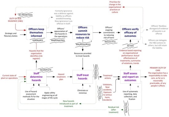 Were a similar accident to occur now, the directors and executives would be exposed to criminal charges for neglecting their duties in multiple areas. The diagram in Figure 11 illustrates some of the common weaknesses: incomplete hazard assessments, under-resourced treatment plans, processes that are overwhelmed by the number of incidents, neglect of introduced and residual risks, poor culture towards violations, ad-hoc or lack of reporting of safety statistics to the board. These are known barriers to effective risk management at the engineering level. Organisations absolutely are expected to be competent at these processes, since the risk assessment process is well-established.