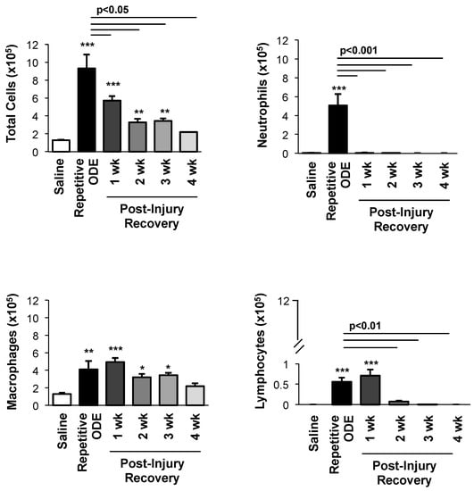 3.1. Airway Cellular Influx in BALF after Repetitive ODE Treatments and Following the 1–4 Week Post-Injury Recovery Periods