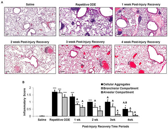 Recovery from repetitive ODE exposure is marked by persistent cellular aggregates for up to 4 weeks in the lung tissue. C57BL/6 mice were intranasally treated with saline or ODE daily for 3 weeks (repetitive ODE exposure) or treated with ODE daily for 3 weeks followed by no treatments for 1, 2, 3 or 4 weeks (post-injury recovery time periods). (A) Representative 4–5-μm thick murine lung section (H&E) stained from each treatment group (10× magnification) is shown. Line scale is 100 μm; (B) Mean semi-quantitative distribution of inflammatory scores of lung cellular aggregates, bronchiolar inflammation, and alveolar inflammation in mice (N = 5 mice/treatment group). Error bars represent standard error of mean (SEM). Statistical significance (* p < 0.05, *** p < 0.001) versus saline. Statistical significance also denoted by A: p < 0.05 vs. repetitive ODE treatment; B: p < 0.05 vs. 1 week recovery time point.
