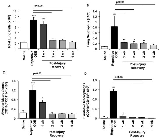 To further delineate the post-injury inflammatory cellular effect observed in the lung tissue, cells were dissociated from whole lung and analyzed as described in the Methods section following repetitive ODE treatment and post-injury recovery time periods. Repetitive ODE treatment resulted in increased total whole lung cell influx that persisted following the 1-week post-injury as compared to saline treatment (Figure 3A). Lung neutrophils were significantly decreased by 1 week post-injury, but remained elevated as compared to saline control until 4 weeks post-injury recovery time period (Figure 3B). Alveolar CD11c+CD11bl0 macrophages and exudative CD11c+CD11bhi macrophages induced by repetitive ODE exposure remained increased at 1 week post-injury as compared to saline, but were significantly decreased as compared to repetitive exposure (Figure 3C,D).