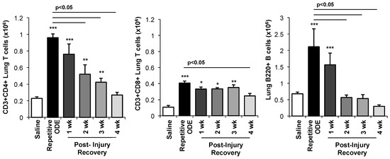 Lymphocytes, particularly CD4+ and CD8+ T cells, demonstrated prolonged persistence in the lung following removal of ODE. Mice were intranasally treated with saline or ODE daily for 3 weeks (repetitive ODE exposure) or treated daily with ODE for 3 weeks followed by no treatment for 1, 2, 3, or 4 weeks (post-injury time periods) whereupon mice were euthanized, lavage fluid removed, and lung cells dissociated. Lymphocytes were identified by CD45 positivity and characteristic FSC (Forware SCatter) and SSC (Side SCatter) properties of lymphocytes followed by staining for CD3, CD4, CD8, and B220. Total numbers of each lymphocyte population were determined by multiplying the frequency of CD3+CD4+ cells, CD3+CD8+ cells, or CD3−B220+ cells (among the CD45+ leukocytes) by the total lung cell number for each mouse. Bar graph depicts mean with standard error bars of N = 4–5 mice/treatment group. Statistical significance (* p < 0.05, ** p < 0.01, *** p < 0.001) versus saline. Line denotes significant difference (p < 0.05) between repetitive ODE and a post-recovery time point.
