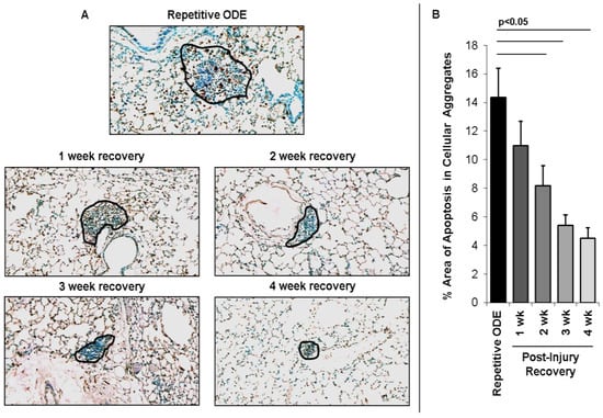 Apoptotic cells within cellular aggregates diminish over time following final repetitive ODE exposure. Mice were intranasally treated with ODE for 3 weeks or treated repetitively with ODE followed by no treatment for 1, 2, 3, or 4 weeks (post-injury recovery time period). (Panel A) representative 4–5-μm thick section stained using Apoptag for apoptotic cells of a mouse from each treatment group (20× magnification) with cellular aggregates outlined in black. Line scale is 100 μm; (Panel B) Bar graphs depicts mean percentage area of positive apoptotic events within cellular aggregates with SE bars. A minimum of 32 images from 4 mice per group were analyzed using Image-Pro Analyzer software. Line denotes significant difference (p < 0.05) between repetitive ODE and a post-injury recovery time periods.