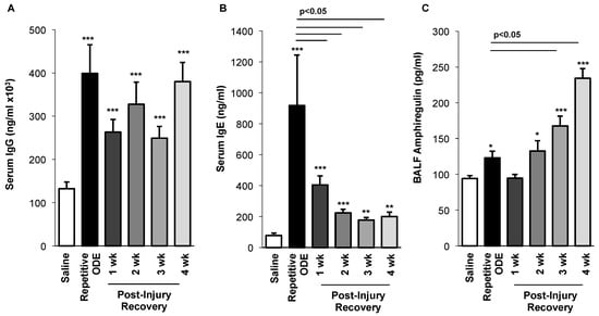 Serum immunoglobulin and bronchoalveolar lavage fluid amphiregulin levels over time following repetitive ODE exposure. Mice were intranasally treated with ODE for 3 weeks or treated daily for 3 weeks with ODE followed by no treatment for 1–4 weeks (post-injury recovery time period). (A) Serum IgG and (B) IgE levels were increased following repetitive ODE exposure and remained elevated as compared to saline control for up to 4 weeks cessation of ODE exposure; (C) Amphiregulin levels in BALF increased over time following cessation of repetitive ODE exposure. Bar graphs depict mean with standard error bars of N = 4–9 mice/treatment group. Statistical significance (* p < 0.05, ** p < 0.01, *** p < 0.001) versus saline. Line denotes significant difference (p < 0.05) between repetitive ODE and a post-injury recovery time point.