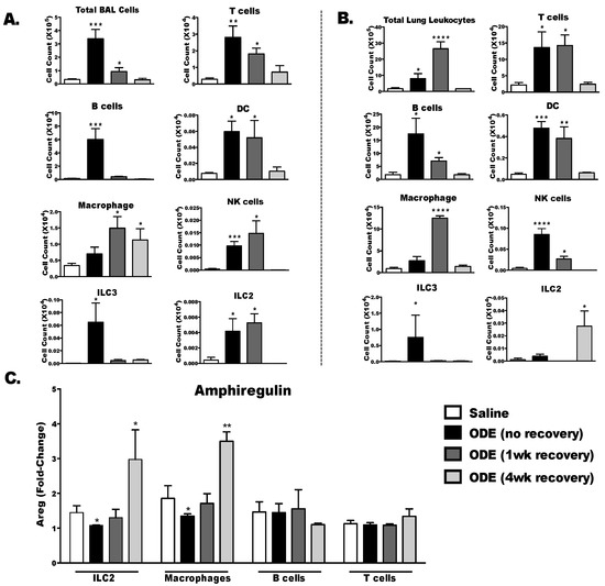 Frequency of immune cell populations and immune cell sources of amphiregulin production over time following repetitive ODE exposure. Mice were intranasally treated with ODE for 3 weeks or treated daily for 3 weeks with ODE followed by no treatment for 1 and 4 weeks (post-injury recovery time period). (A) BALF and (B) perfused lung tissue were collected to determine composition of immune cell populations present in these tissues using flow cytometry; (C) Type 2 innate lymphoid cells, macrophages, B cells and T cells were isolated from the lungs and stimulated for 24 h with phorbol 12-myristate 13-acetate (PMA)/Ionomycin. Amphiregulin (Areg) levels were quantified in cell-free supernates by ELISA. Data expressed as fold change in Areg induced by PMA/Ionomycin compared to respective media control. Bar graphs depict mean with standard error bars of N = 3–4 mice/treatment group. Statistical significance (* p < 0.05, ** p < 0.01, *** p < 0.001, *** p < 0.0001) versus saline.