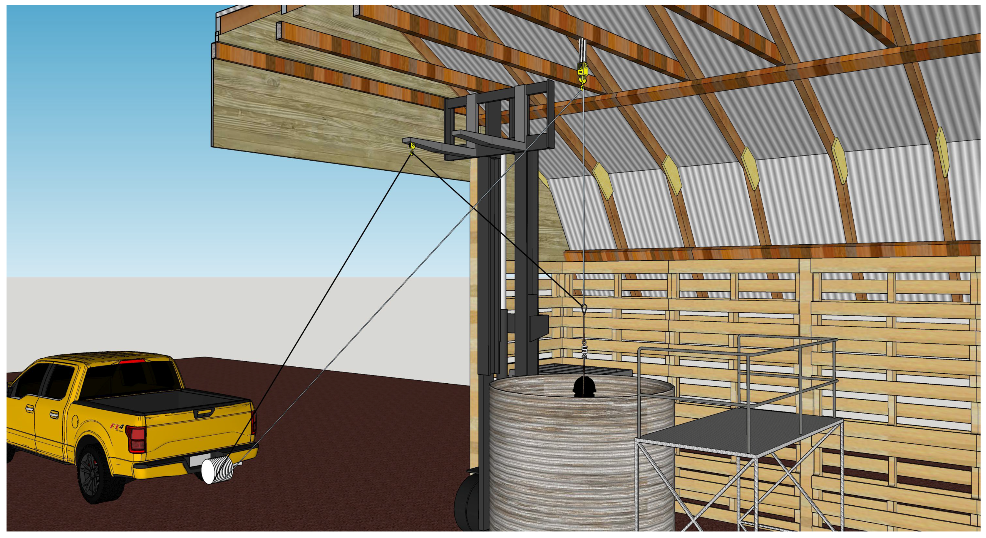 Experimental setup showing location of mechanical winch, forklift (angle anchor point), vertical anchor point, and observation deck. Grain bin was located on top of grain pit and below grain loading output (not shown).