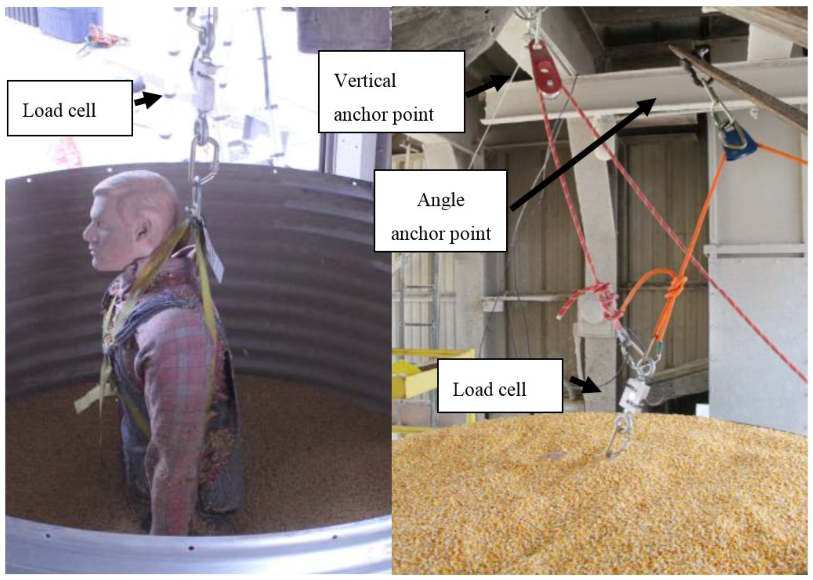 Earlier, Roberts et al. [5] reported a case study in which a co-worker attempted to extricate an entrapped victim by tying one end of a rope around their (the victim’s) chest, running the rope outside the grain bin and tying the other end to a pickup truck, then driving the truck away from the bin in an effort to pull the victim out. The victim ended up suffering fatal injuries due to the forces applied on their body, which begs the questions: Did pulling the victim at an angle increase the total force on their body and, if so, do these forces exceed the human capacity to survive them? The study presented here sought to expand on previous research by testing the amount of force required to extricate a mannequin out of grain at various angles.