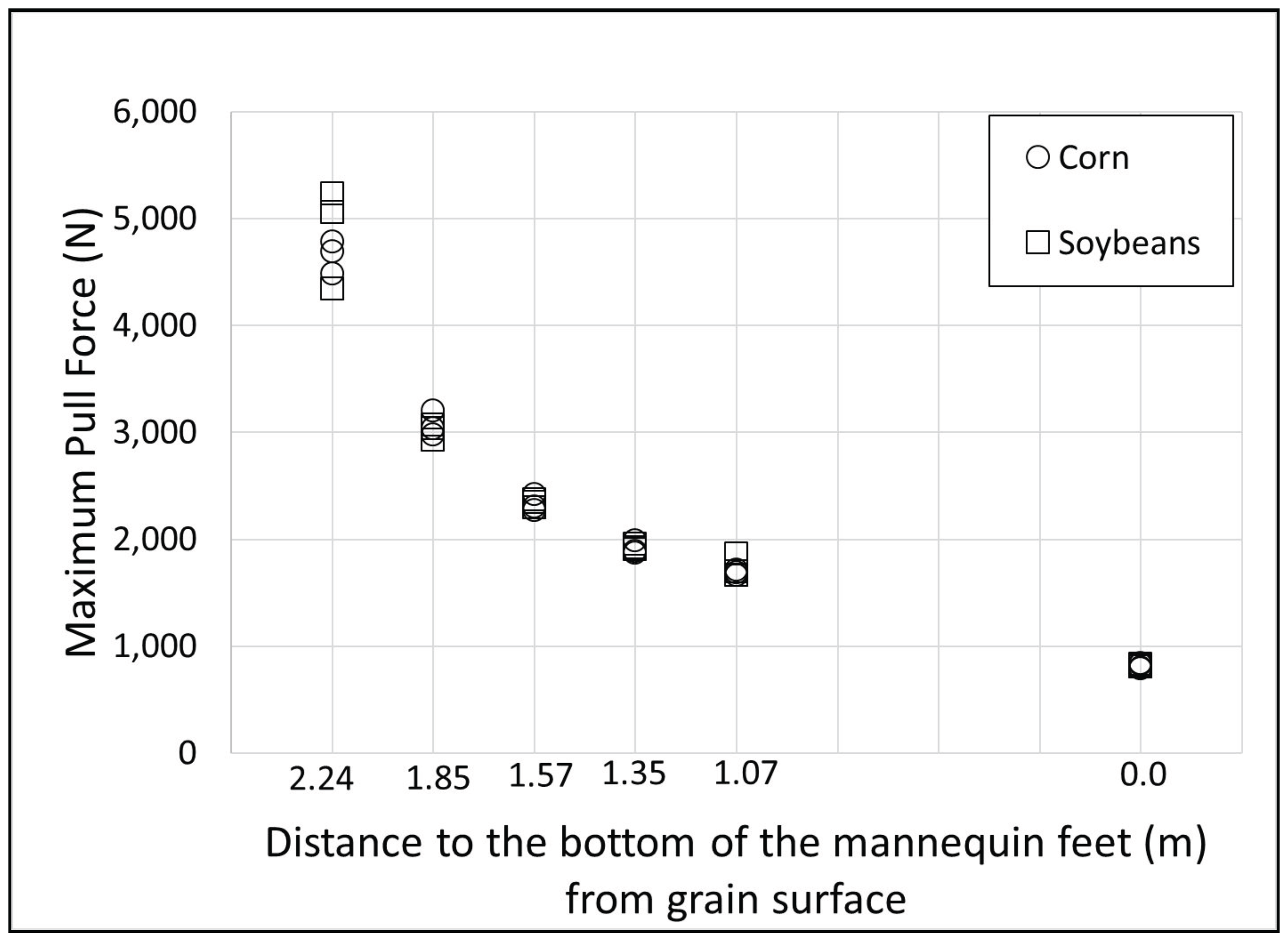 Table 1 shows the amounts of pull-force required to free the mannequin entrapped vertically (upright) in the corn and the soybean grain masses at the five different depths (i.e., 38 cm above-head, head, shoulder, chest, and waist levels). The last measurement point (0.0 m) shown in the table is the mannequin held freely by the load cell.