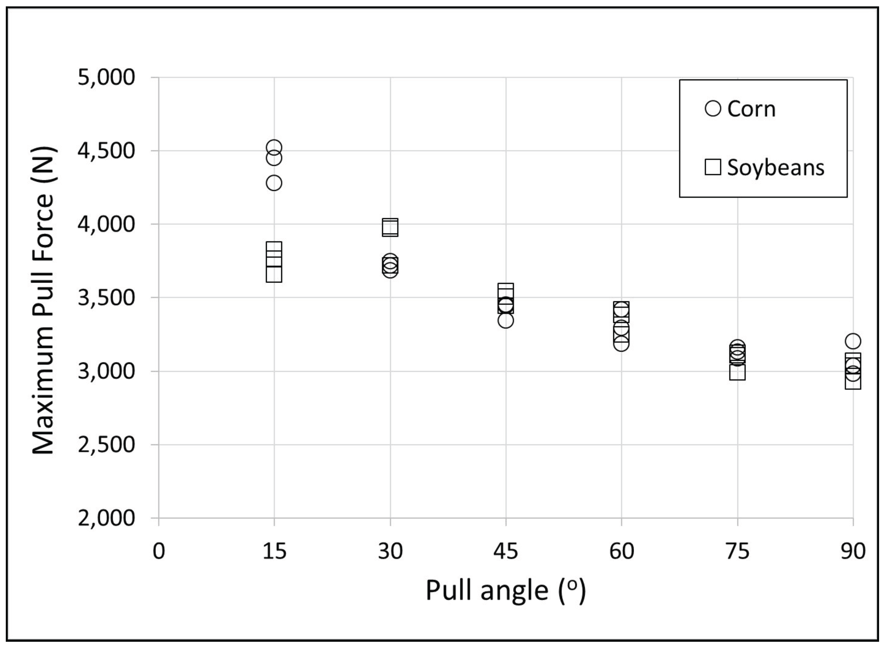 For the soybean entrapments, the pull force was not significantly different between (a) the 60°, 75°, and 90° angles; (b) the 45° and 60° angles; and (c) the 15° and 30° angles. Pull force values for all other angle combinations were significantly different from each other at p < 0.05. The measurements between corn and soybeans were not significantly different at angles of 30°, 45°, 60°, 75°, and 90°, but they were for the 15° angle at p < 0.05 (Figure 4). As for corn, the required peak forces for extrication increased as the angle of the pull was reduced.