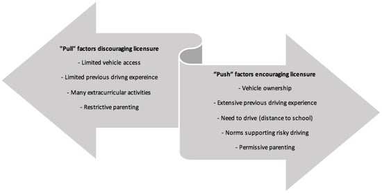 There may be several “push” and “pull” factors influencing licensure timing and the duration of the learner license period. In the United States and elsewhere, teens cite factors that pull them back from getting licensed such as the cost associated with driving, the ability to get around without a car, and being busy with out-of-school activities as reasons for licensure delay [10,11,12]. In contrast, some teens are highly motivated (pushed) to begin driving and obtain their learners’ permit within days of reaching eligibility [13]. These teens will typically have access to their own vehicle when they begin driving, or have part-time employment which requires them to drive [10,14]. It is likely that teens are not only pushed or pulled, but these factors vary within teens, they may interact, and may change overtime.